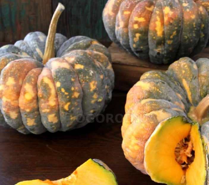 Растение плетистое. Главная плеть средней длины. Лист крупный, светло-зеленый, без белой пятнистости, нерассеченный. Очень красивая ребристая, округло-плоская тыква массой около 5 кг. Корочка у нее зеленовато-черного цвета, но во время хранения иногда приобретает оранжевый загар. Мякоть у нее насыщенно-оранжевая, сладкая, ароматная. Вкус хороший.